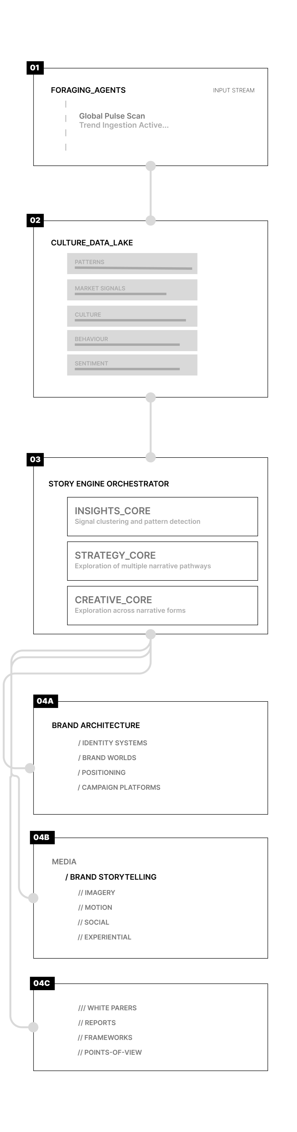 STORYENGINE1 is a system for continuously turning signals into stories. It gathers inputs from culture, behaviour, and data then interprets them through strategic and creative frameworks and transforms them into narrative outputs across genres, platforms and formats.