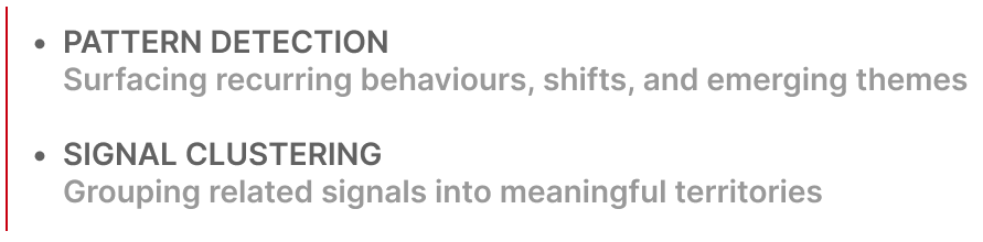 All signals are stored in a centralised system designed for retrieval and recombination. This allows us to detect patterns across time, context, and category — revealing connections that would otherwise remain invisible.